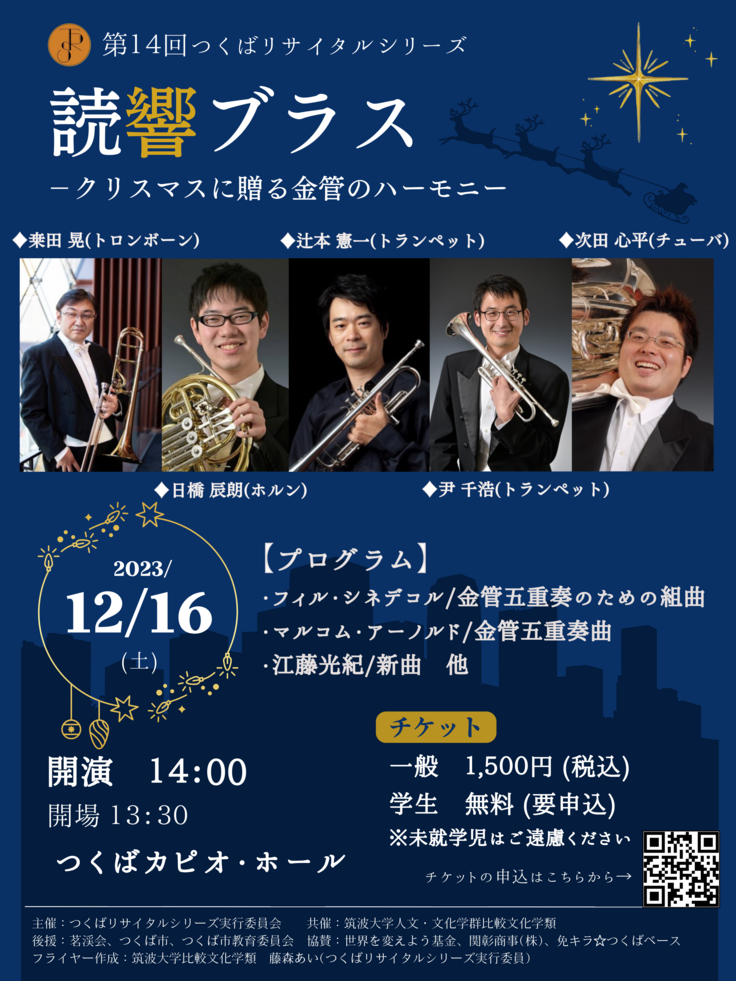 第14回は、第7回でもお招きし大きな反響を頂いた読響ブラスを、つくばの地に再びお招きします!演奏して頂くのは、トランペット、ホルン、トロンボーン、チューバの四種類の楽器、五名の演奏者からなる金管五重奏です。 日本を代表するオーケストラ、読売日本交響楽団。その金管セクションの中でもトップクラスの実力を誇る演奏家の方々で編成される読響ブラスの、迫力ある音圧を生でご体感頂けます。クリスマス気分を盛り上げる華やかなハーモニー、さらには曲間の軽妙なトークショーも、ぜひお楽しみ下さい!