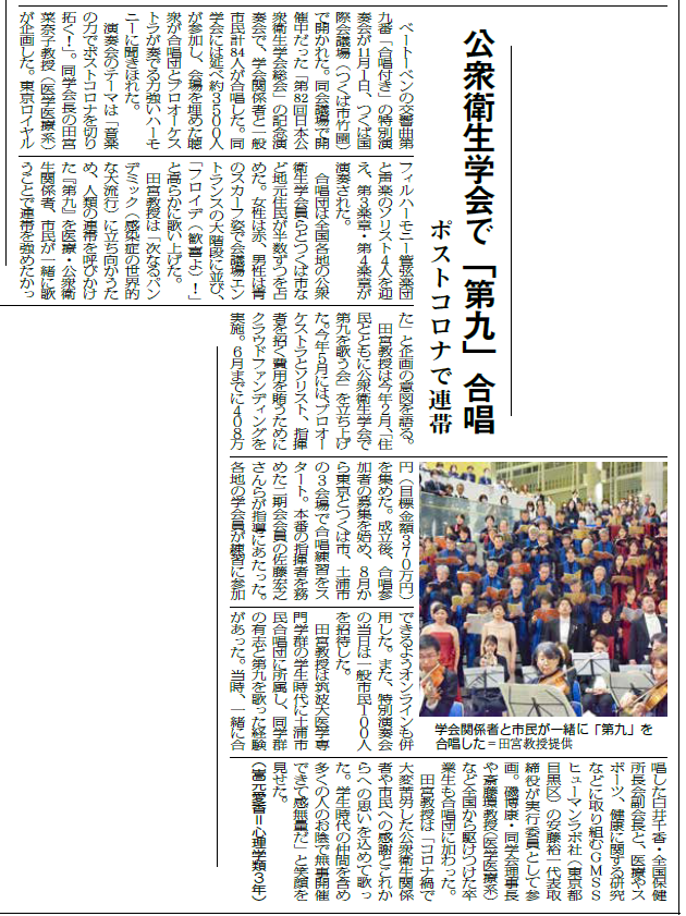 公衆衛生学会から早くも1か月余が過ぎ、本格的な演奏会シーズンを迎える中で日本は年末の「第九の季節」を迎えつつあります。