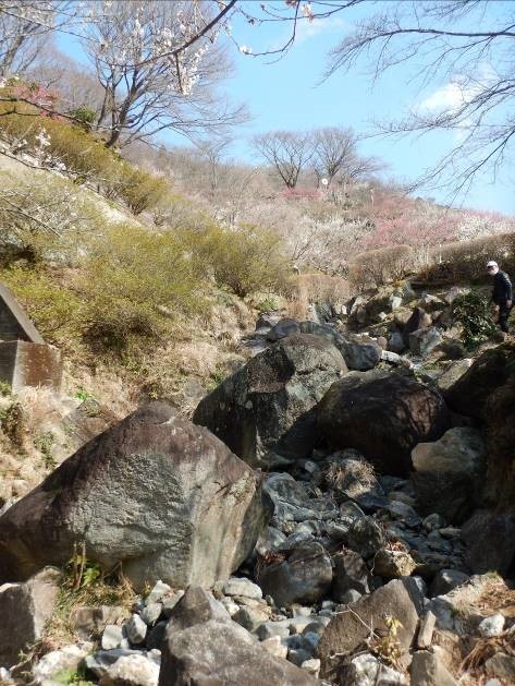 ちなみに、梅林の近くの崖を作っている岩石は花こう岩です。花こう岩は、雨風にさらされるとボロボロになって崩れやすくなります。ボロボロになった花こう岩と筑波山山頂付近の斑れい岩の巨礫は、大雨が降ると土石流となって流れ下ります。筑波山の美しい緩やかな斜面は、土石流で流れ下った土砂がたまってできた斜面なのです!筑波山のなだらかな美しい斜面の裏には、土石流の恐ろしさがあったのですね。