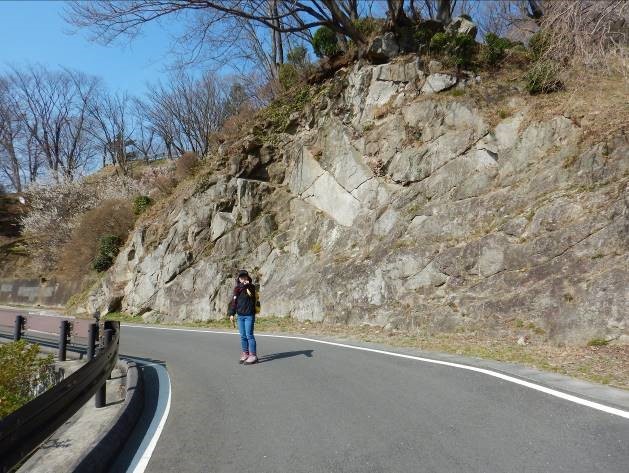 筑波山梅林の道路沿いには大きな崖がありますが、この崖を作っている岩石は巨礫と違う種類のようです。では、筑波山梅林に転がる大きな岩石は、いったいどこから来たのでしょうか?
