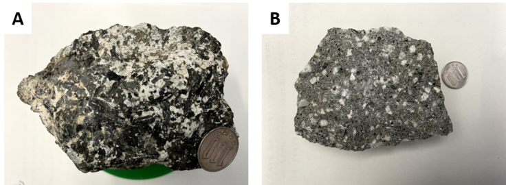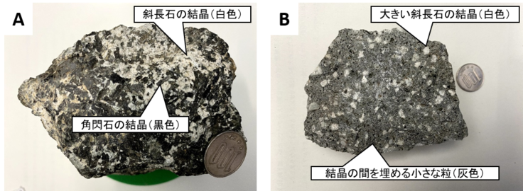 ちなみに写真Bは、火山によく見られる安山岩(あんざんがん)と呼ばれる岩石です。安山岩は、大きい結晶の周りは目に見えないくらいの小さな粒で埋められています。
