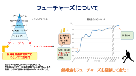 将来世界のトップで活躍する選手の誰もが通る「登竜門」となる国際テニス大会です。あの錦織選手をはじめ世界で活躍している選手たちはこのフューチャーズを足がけに世界へ羽ばたいていきます。(フューチャーズなどの下のグレードの大会でポイントを稼ぎランキングを上げることでウィンブルドンなどのグランドスラム出場を目指します。)