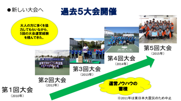 そして僕らには、丁寧にサポートしてくださる筑波大テニス部のOB、OGさんがいます。過去5大会の運営ノウハウもあります。学生としての意欲、覚悟は前述した通りです。唯一僕らに足りないもの、それは大会資金です。僕ら学生だけの力ではどうしようもありません。どうか、僕らに一度大会運営のチャンスをください。みなさんの力と僕らの日々の努力が一つになったとき、必ずや今まで以上の素晴らしい大会ができるものと信じます。つくばから未来の「錦織圭」を!どうかよろしくお願いします。