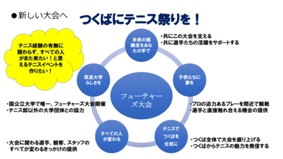 過去5年間筑波大学でこのフューチャーズが開催されてきました。今までは外部の大人の力をかりて、それを硬式庭球部の部員がサポートをするという形で大会運営をしてきたのですが、今大会から運営体制が180度変わり「0」から学生が主体となって大会を創りあげることになりました。
