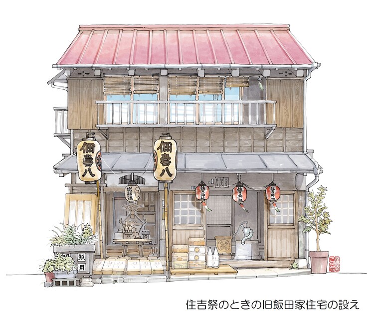 旧飯田家住宅は、日常的には佃島の有力な魚問屋でしたが、同時に地域コミュニティの中心として位置付けられ、舟入堀の水中に埋められた「大幟」を掘り出して建てることで知られる佃島住吉神社の例大祭の「住吉祭」では、「佃住吉講二部」の重要な祭礼拠点として利用されてきました。
