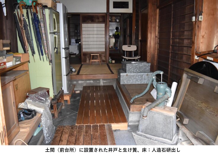 旧飯田家住宅は、「佃喜八」という屋号をもつ日本橋魚市場の魚問屋の併用住宅として大正9年(1920)頃に建築されました。佃島の「中通り」に面して建つ2階建の出桁造(だしげたづくり)町家で、魚問屋らしく北側に生け簀(いけす)と手押しポンプの井戸を配した広い土間をもち、南側には住宅への玄関を独立して設けていることが特徴です。土間の入口の鴨居には、商家のステータスとなる背の高い人見梁(ひとみばり)を用い、大八車が入りやすいように敷居が外れるようになっています。
