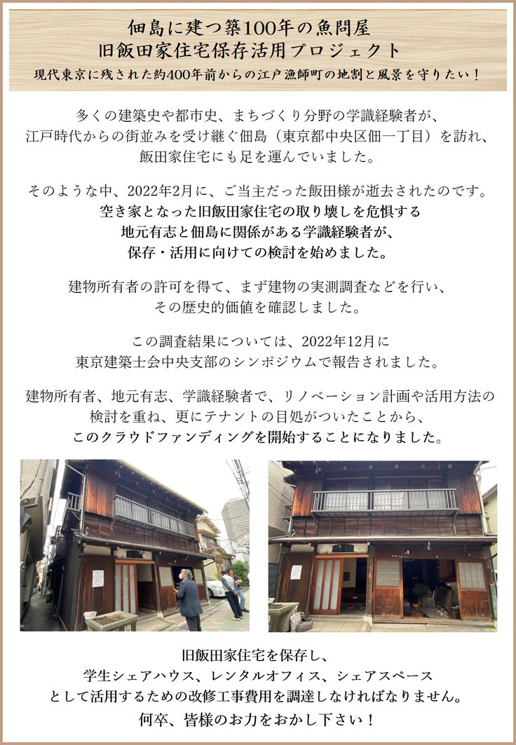 ※土地所有者様、建物所有者様(佃島旧飯田家住宅活用委員会メンバー 壁谷 佳世様)からプロジェクト・クラウドファンディングを行うことの許諾を取得しております。