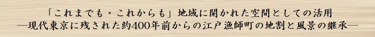 このように江戸から東京へと約400年の時を重ねたきわめて稀有な佃島の生活文化を、日本橋魚市場の魚問屋としてまた地域コミュニティの中心として、長く紡いできた旧飯田家の貴重な歴史的建築を保存活用することによって、佃島という「場所」のもつアイデンティティを東京ウオーターフロントの未来につなげていきたい、というのが我々の思いです。
