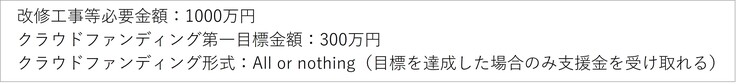 - 必要金額と目標金額の差額は自己資金にて補填いたします。万が一自己資金でも確保できなかった場合はプロジェクトが大きく変わらない範囲で規模を縮小するなどして対応し、返金は致しかねます。