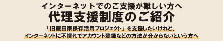 皆様からのご支援金は飯田家住宅を保存・活用する為に、事業工事事前調査費用や設計費用、工事費用、登録有形文化財(建造物)申請に係る調査、火災保険料、その他経費として、大切に使わせていただきます。