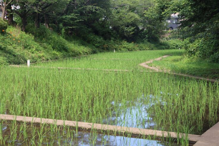 駒場東大駅前から駒場小学校を通り、駒場野公園正門→水田銘板→ケルネル水田→水田の碑を見て頂くルートがお勧めです(※ケルネル水田には自由に入ることができません。公園内の通路から見下ろす形で見学できます)。四季折々の水田の姿があり、6月は紫陽花の花がきれいに咲いていました。