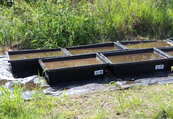 採取した土壌は、深さ 20~30cm 程度、縦横 60×80cm 程度の9個の箱に巻き出しました。土壌を巻き出した9個の箱を校内に置き、水の管理および発芽植物の観察を行いました。観察は約半年続けました。下の写真が発芽試験の様子です。水がなくならないように、生物部の生徒にお願いしながら、夏日も水やりを続けました。