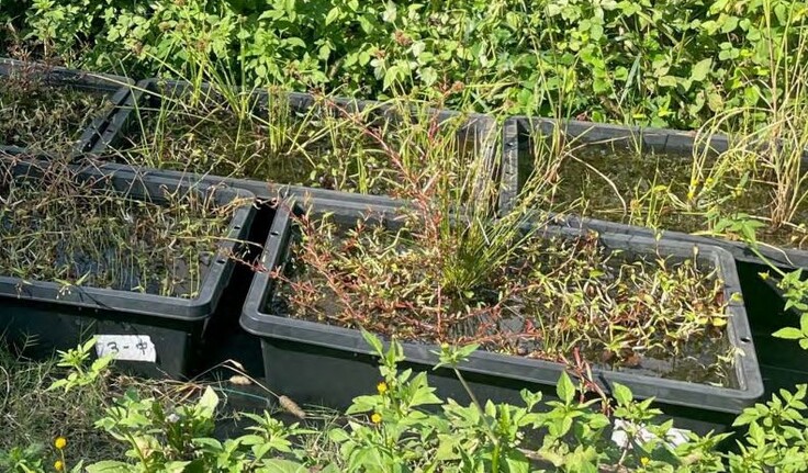 改修工事により水田全体の表層土が掘り返され、土壌改良されると、表層土壌に依存する植物などは大きく減少する可能性があると考えられます。また、中の土を掘り出して広げると、温度差などで埋土種子が発芽ことがあります。そこで、2023年7月~9月の間、中層にある土の発芽試験を行いました。これは、新しい種子が発見される可能性があるためです。ケルネル田んぼ内の6ヶ所において、水田耕作前の2023年5月2日に土壌採取を行いました。採取深度は➀深さ 40cm 程度、➁深さ40cm以上の2種類としました。