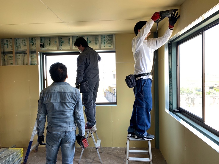 天井にも、屋根からの熱を防ぐために断熱材を敷き詰めていきます。