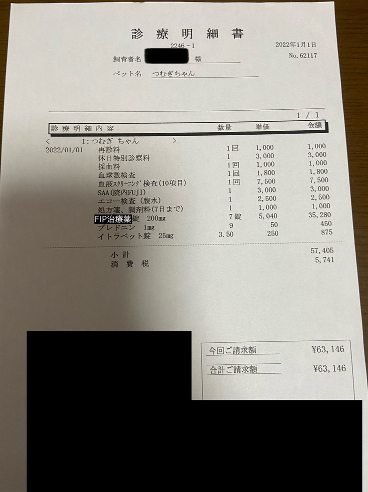 FIPの経過把握のための定期通院でした。今回は検査もしてもらい数値もよくなっているし、薬の副作用で肝機能が低下することもあるがその様子もないとのこと。FIPのほうが落ち着いているため、皮膚のかゆみを取り除くステロイド剤も追加で投薬となりました。腹水もほとんど残っていないのに加えて体重も増えていることことからも薬の効果が良好でとのことでほんとによかったです。