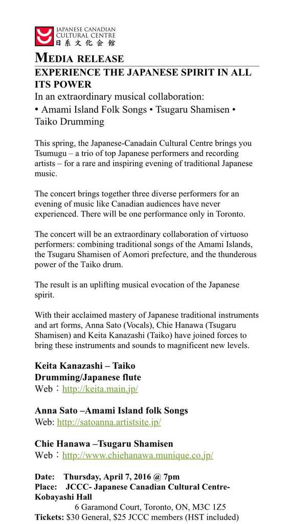 4月7日トロント日系文化会館でのコンサートチケット発売開始しました!