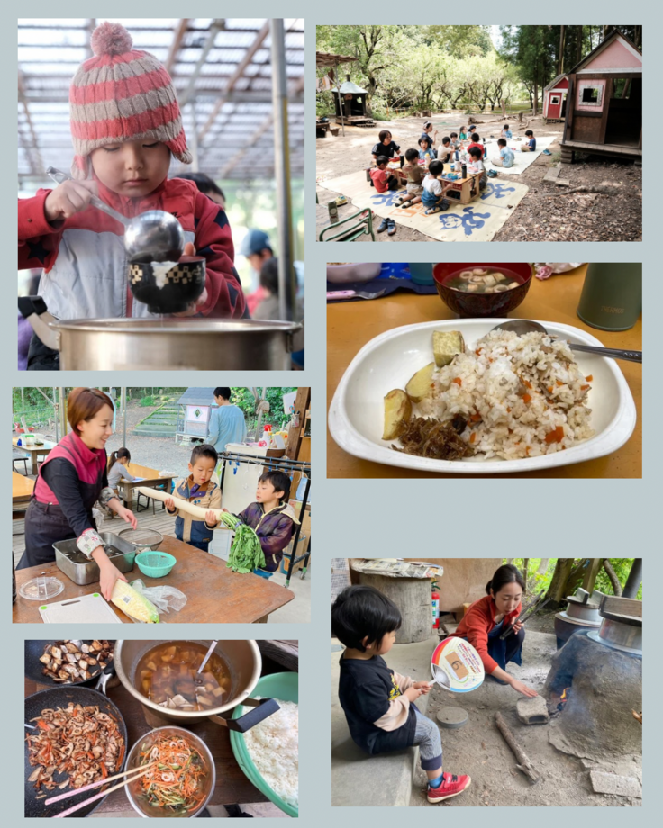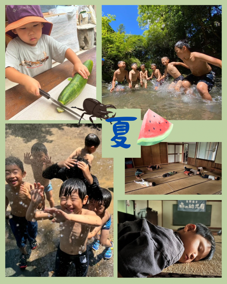 自然保育森の幼児園では子どもたちは1年中のほとんどを外で過ごし、毎週の山登り、給食のご飯は釜戸炊き、夏は毎日川遊びと自然を感じながらのびのびと過ごしています。