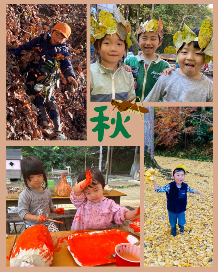黄色の葉っぱの絨毯で雪合戦ならぬ黄葉合戦をしたりふかふかの落ち葉を滑り台にしたり。
