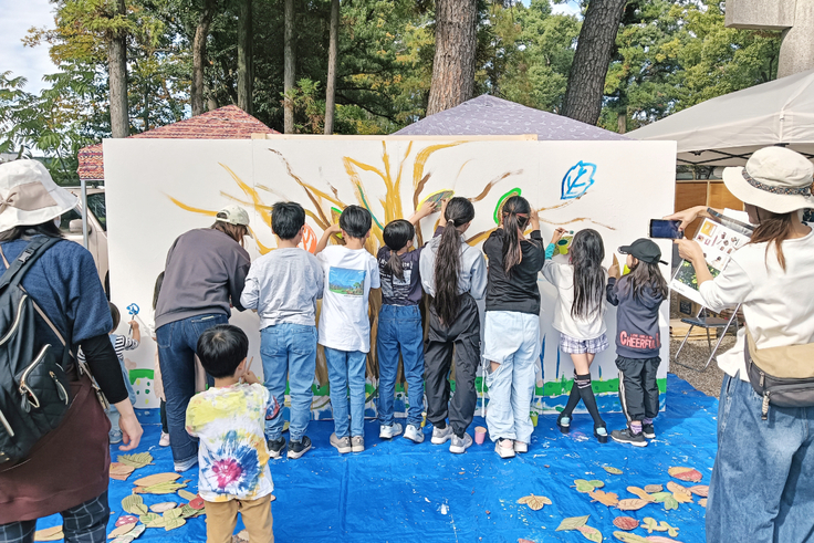 「自作のお面をつけた初めてのライブペイント。緊張もありましたが、子どもたちが夢中で絵を描き加えてくれて、深い森のような作品になりました。こんな機会をいただけたこと、本当に嬉しかったです」