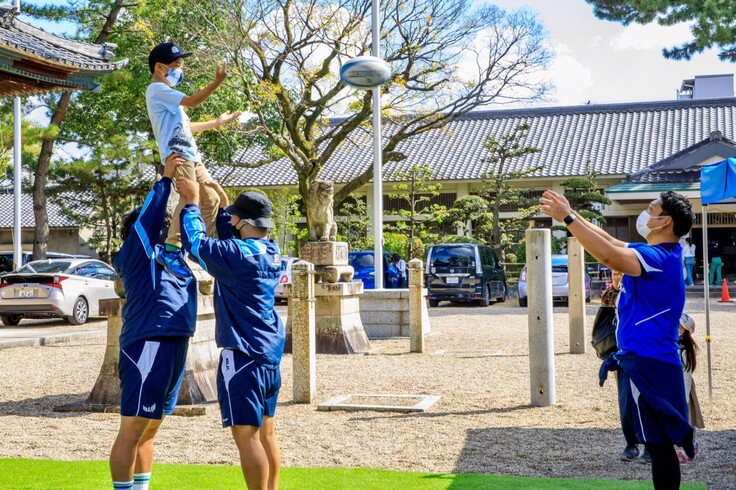 ラグビーの現役選手の方を相手に本気でタックルをしたり、一緒にキャッチボールをしたり、生でラグビーの楽しさが体験ができます。現役選手の大きな体とパワーに、子どもも大人も圧倒され、魅了されました。