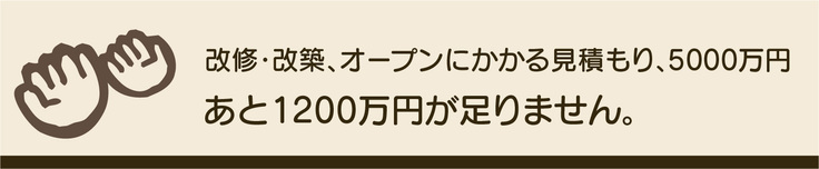 しかしその改築・改修費などで、オープンになんと5000万円もかかるということで、ご支援をいただくために奔走しています。でも、どうしても1200万円が足りません。