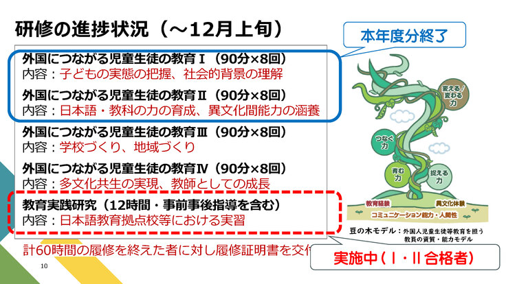 本年12月上旬までの研修プログラムの実施状況です。現在、「外国につながる児童生徒の教育Ⅰ・Ⅱ」が終了し、協力校での実習がおこなわれています(12/13までに実施:桜山中、帯山中、楠小、武蔵ヶ丘小、実施予定:黒髪小)。実習受け入れ校のご協力に心より感謝申し上げます。また、12月下旬には「外国につながる児童生徒の教育Ⅲ」を実施します。