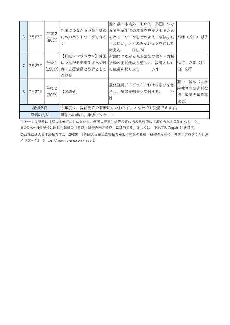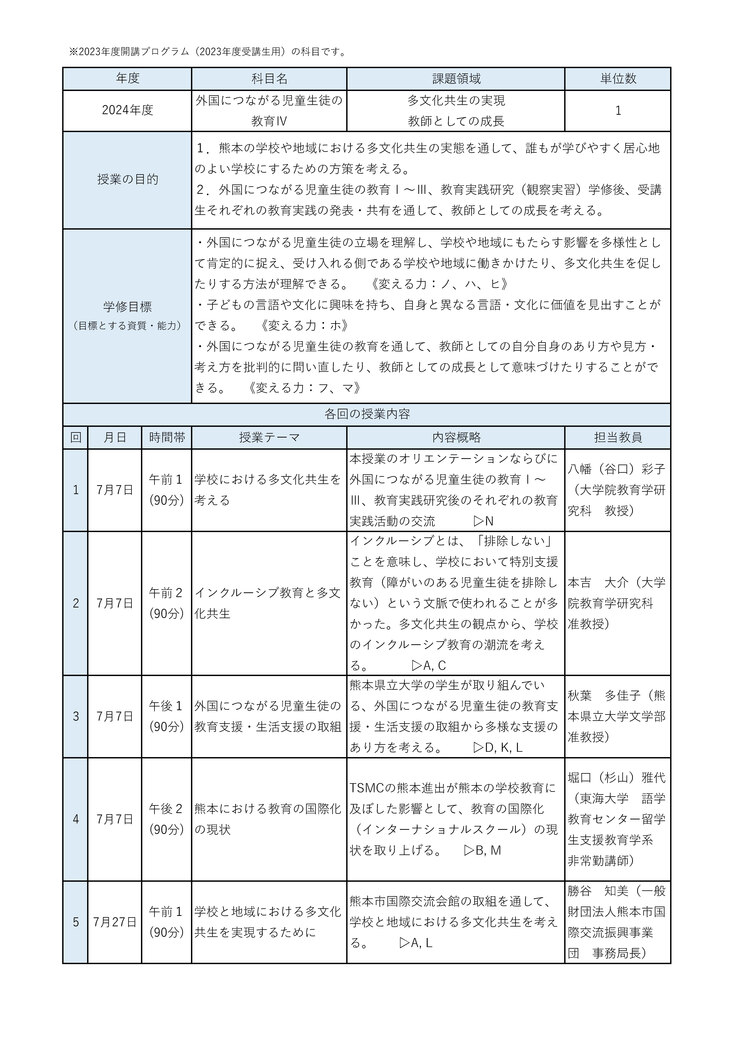 7月7日(日)・27日(土)に外国につながる児童生徒の教育IV(令和5年度未実施分)、7月27日(土)に総括シンポジウム・閉講式を行います。会場は熊本大学教育学部講義室(7月7日(日)は3-C講義室・27日(土)は4-A講義室)です。