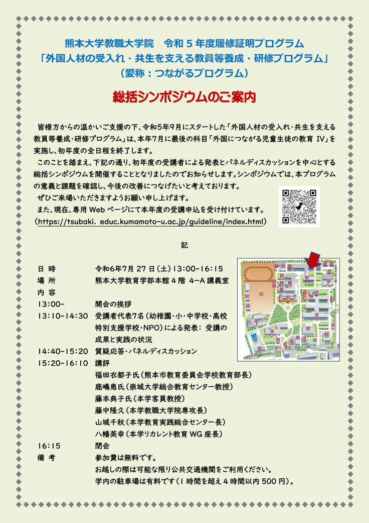 このことを踏まえ、7月27日(土)13時より熊本大学教育学部4-A講義室にて、初年度の受講者による発表とパネルディスカッションを中心とする総括シンポジウムを開催することとなりましたのでお知らせします。