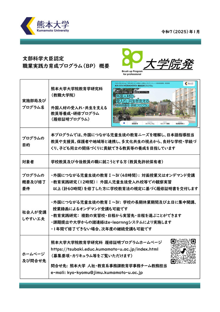 教育再生実行会議「「学び続ける」社会,全員参加型社会,地方創生を実現する教育の在り方について(第六次提言)」(平成27年3月)を受けて,大学・大学院・短期大学・高等専門学校におけるプログラムの受講を通じた社会人の職業に必要な能力の向上を図る機会の拡大を目的として,大学等における社会人や企業等のニーズに応じた実践的・専門的なプログラムを「職業実践力育成プログラム」(BP)として文部科学大臣が認定することとしました。