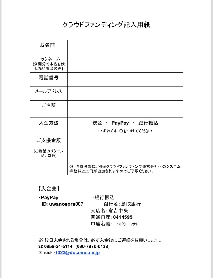 ※ご入金が確認でき次第、実行者の遠藤が代理でクラウドファンディングの決済手続きをさせていただきます。