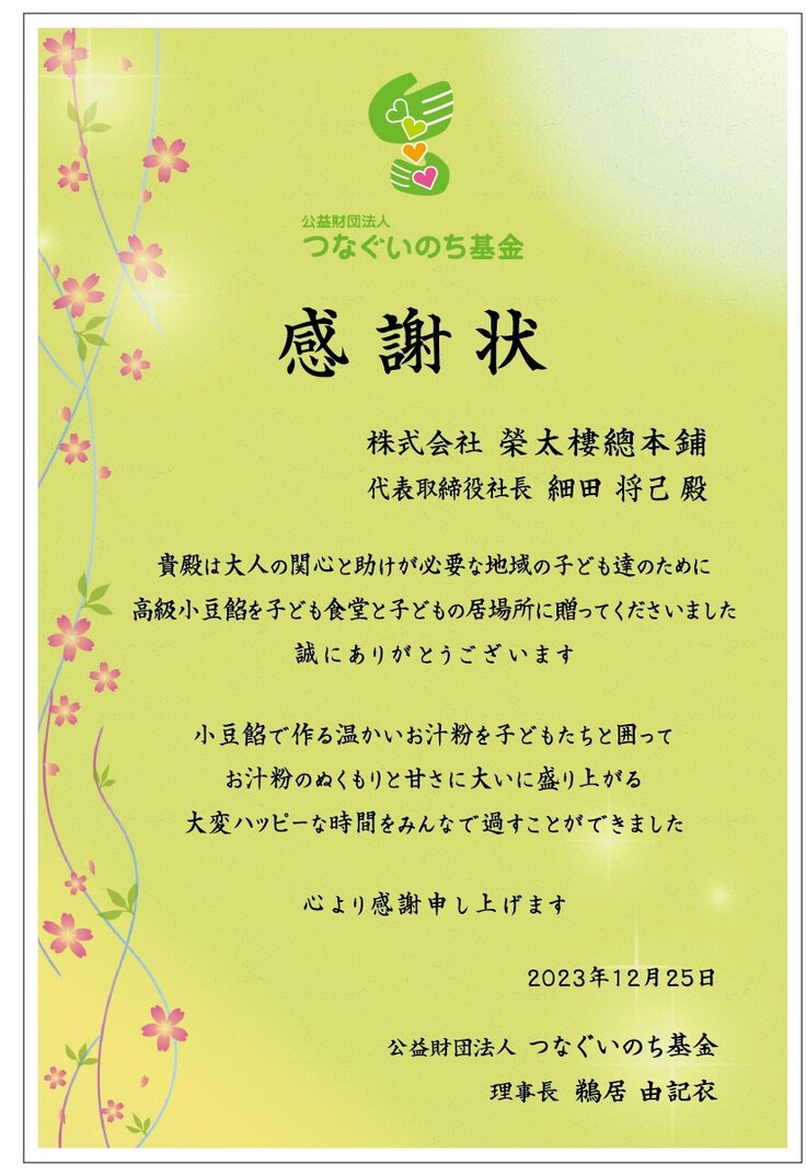 想いある企業と児童支援団体をつなぐ活動、老舗和菓子屋「日本橋 榮太樓」様に感謝状を贈呈しました。