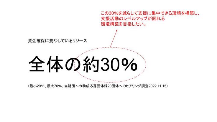 そのために、私たち『つなぐいのち基金』のような中間支援団体は、活動団体の資金調達の負担を軽減する活動を行う必要があると考えました。