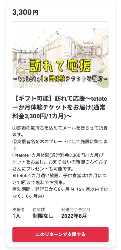 ③tetote1カ月体験(通常料金3,300円/1カ月)チケットをお届け。お知り合いの親御さんやお子さんにプレゼントも可能です。