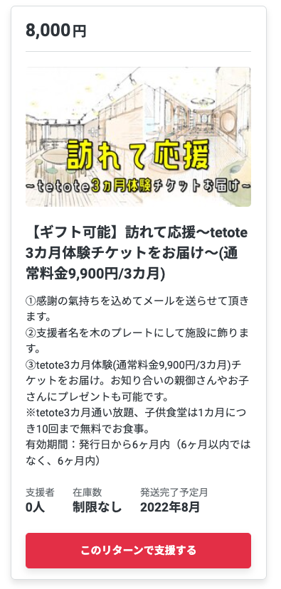 この度、te to te〜つなぐん家〜 体験チケット 1ヶ月バージョン、3ヶ月バージョンの2種類をリターンとして追加させていただきました。