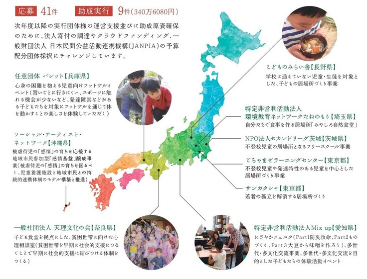 昨年度は、コロナ禍や物価高により、継続的な運営に困難を抱える児童支援団体への緊急財政支援を目的にクラウドファンディングおよび助成事業を実施させて頂きました。全国の児童支援団体を対象にした公募実施、厳正なる審査の下で9団体を採択し、総額340万6080円を助成することができました。