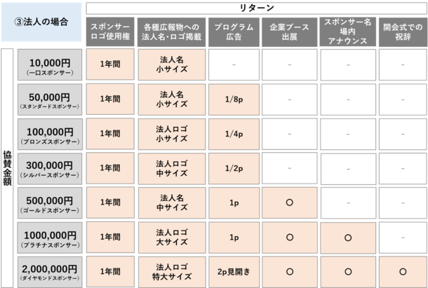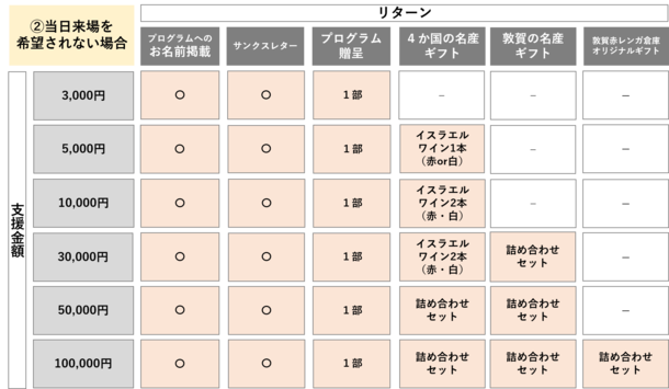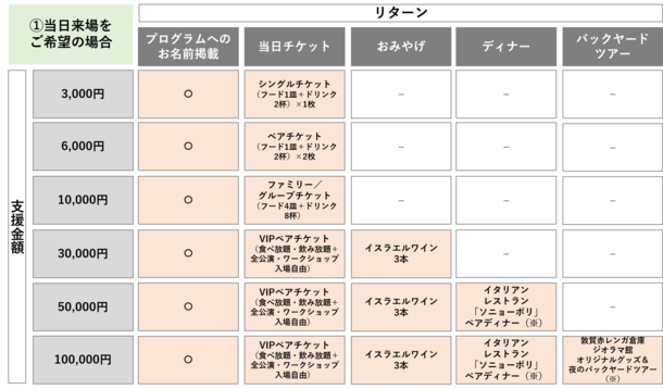①当日来場をご希望の方、②当日来場を希望されない方、③法人の方、それぞれの方に向けたリターンをご用意しております。