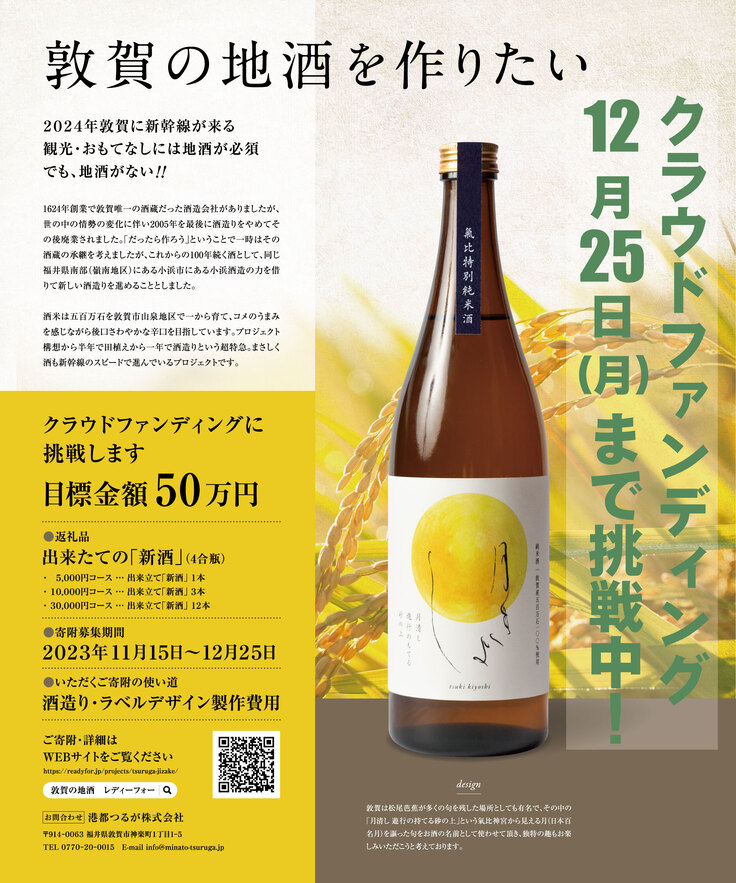 この度の敦賀でもう一度地酒を作ろうという活動に対しまして、ご支援いただいた方から地元に地酒がないのは寂しいと思っていたなどのお声や、温かい応援のお言葉もいただいたりして大変励みになっております。中には敦賀市外の遠方の方々からも応援をいただきまして、地酒造りを通して市外、県外の方々へも敦賀市という場所を知っていただける大変意味のある取り組みになっていると感じております。改めてここまでに支援いただいた支援者様には感謝を申し上げます。引き続き応援のほどよろしくお願いいたします。