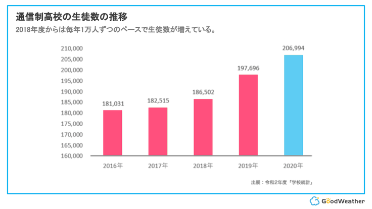 通信制高校は現在、オンライン授業対応、専門コースの豊富さ、生徒さんに合わせたカスタマイズのしやすさ、自由度の高さなどが注目され、少子化で高校生の数は減っているにも関わらず、通信制高校の生徒数は2018年度からは毎年1万人ずつのペースで生徒数が増えています。