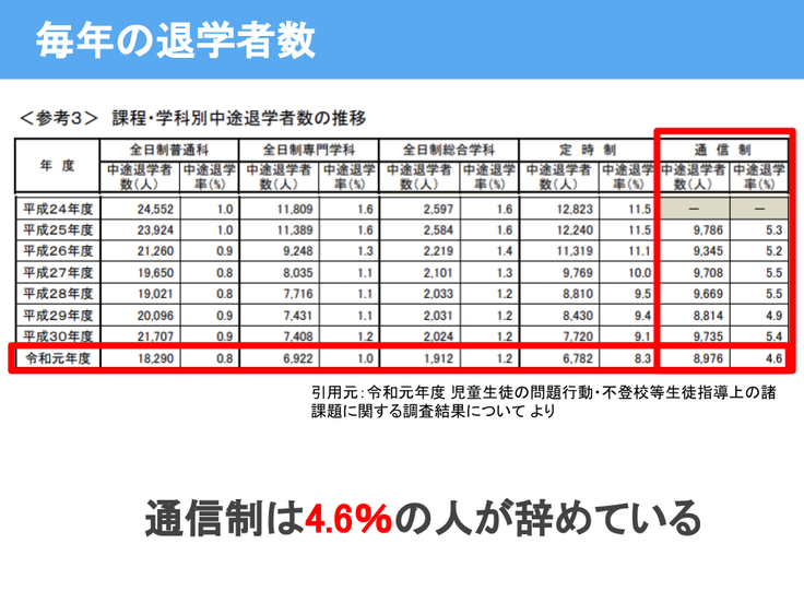一方で、通信制高校の中途退学率は4.6%となっており約20人に1人が通信制高校を辞めてしまっている現状があります。