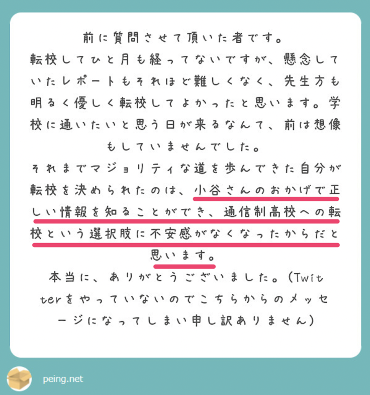 私小谷は、高校時代は通信制高校に通い生徒会長を経験、現在はブログやYouTube、リアルな場での講演活動を通して通信制高校の魅力を伝えていく活動をしております。