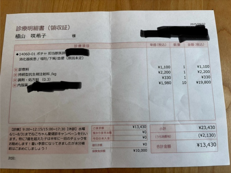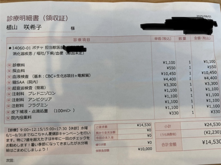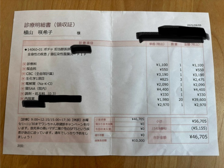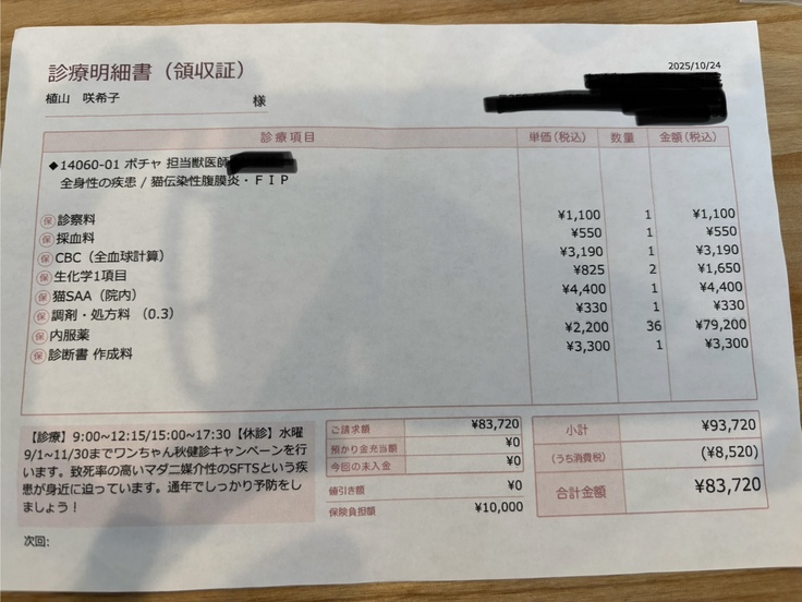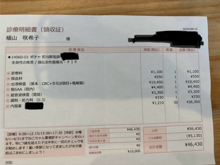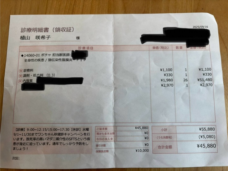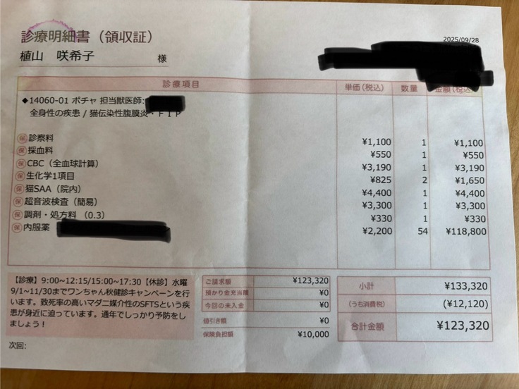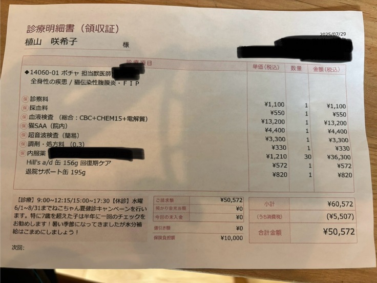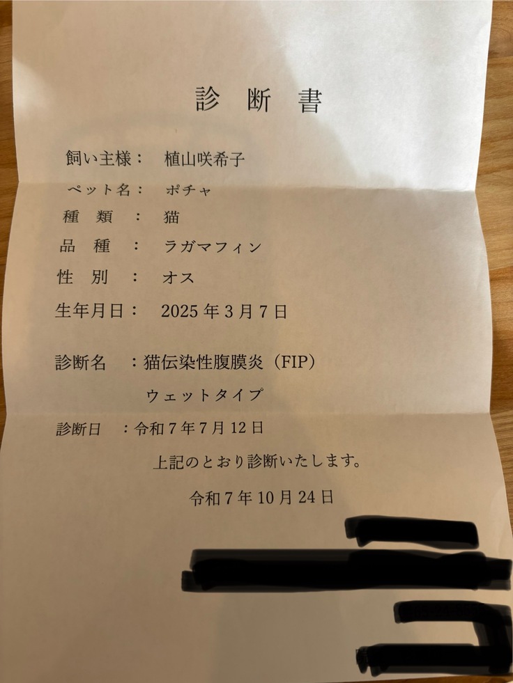 2025年7月10日頃、ぽちゃの体調が急に悪くなり、食欲不振や元気のなさが続いたため、近くの病院で診察を受けたところ、高熱に加えて腹水が見られたことから、「FIP (猫伝染性腹膜炎)の可能性がある。」と言われました。