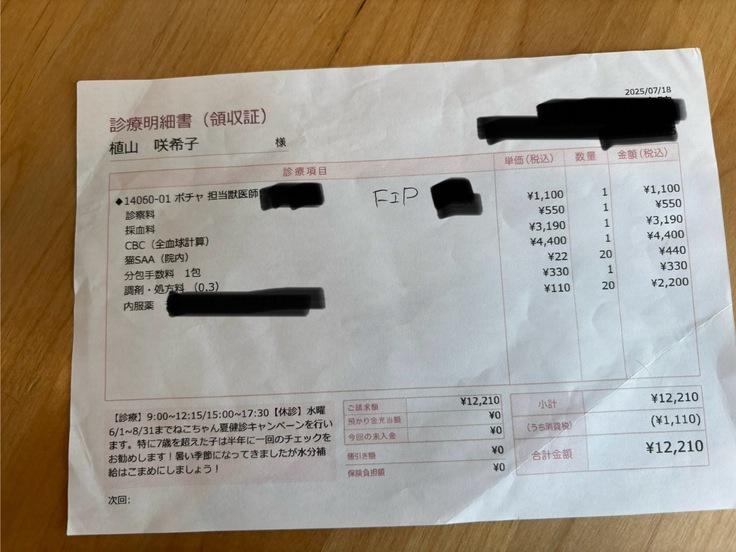 さらに詳しい検査を行い、2025年7月12日にFIP (ウェットタイプ)と正式に診断。すぐに治療を開始しました。
