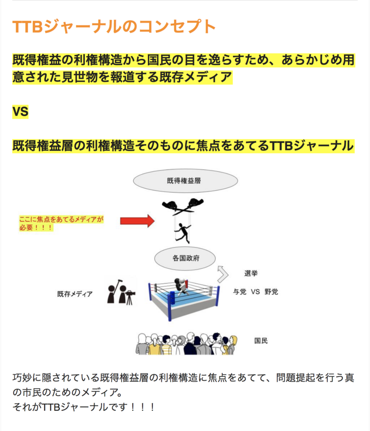 このコンセプトに基づき、今までの既存のメディアとは報道の目的が全く異なる、傀儡の部分に焦点を当てるメディア、それがTTBジャーナルです!!!