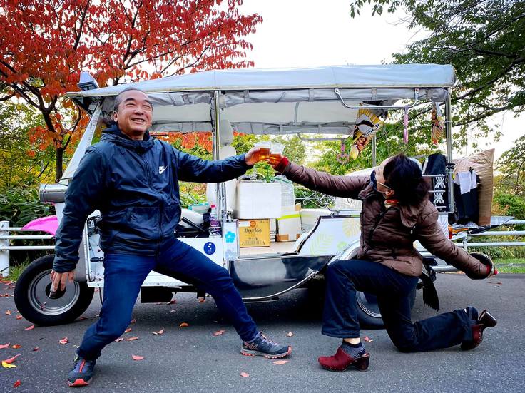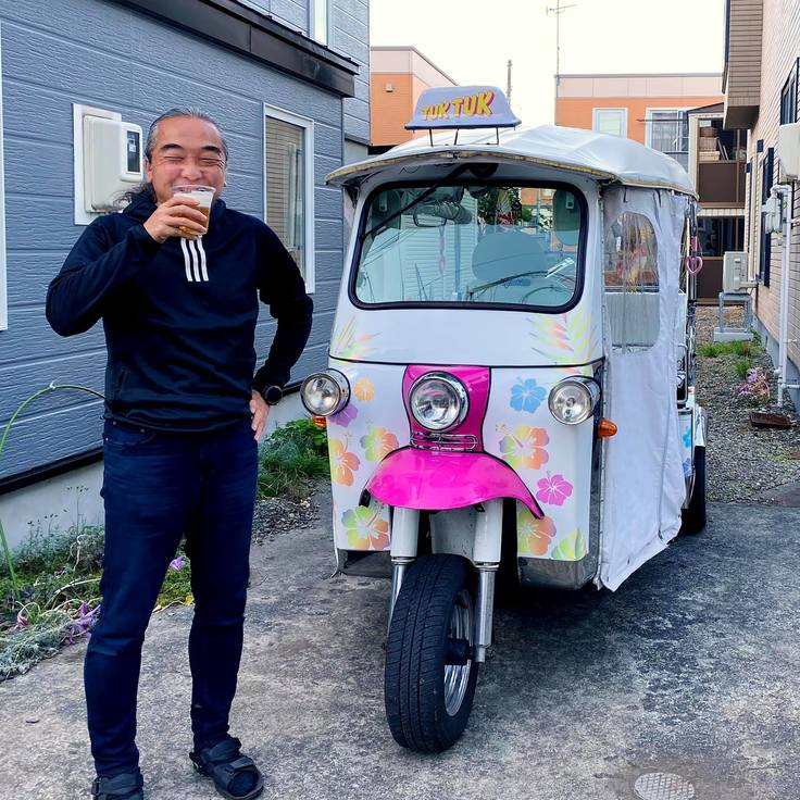 そして、美深白樺ブルワリーから美深の道の駅までトゥクトゥクでヒッチハイクした小林さんご夫婦。美深でクラウドファンディングのリターン"トゥクビア召喚!"を支援してくださり、後日、札幌のご自宅前に召喚してもらいました!