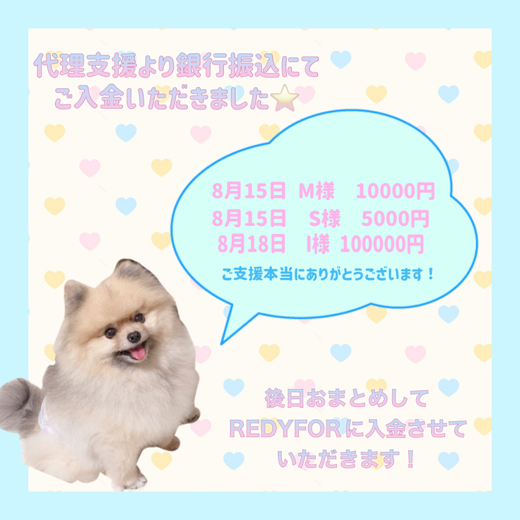 こんなにも沢山の金額をご支援にご協力してくださり、本当に本当にありがとうございます。こんなにも沢山の方や気にかけてくださる方に支えていただき感謝ばかりです。