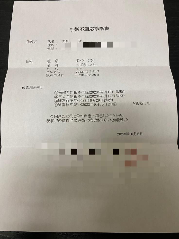 以前お伝えした通り手術が見送りになり、今後の手術についても上記の症状が改善されない場合は手術が難しいことを証明する書面です。
