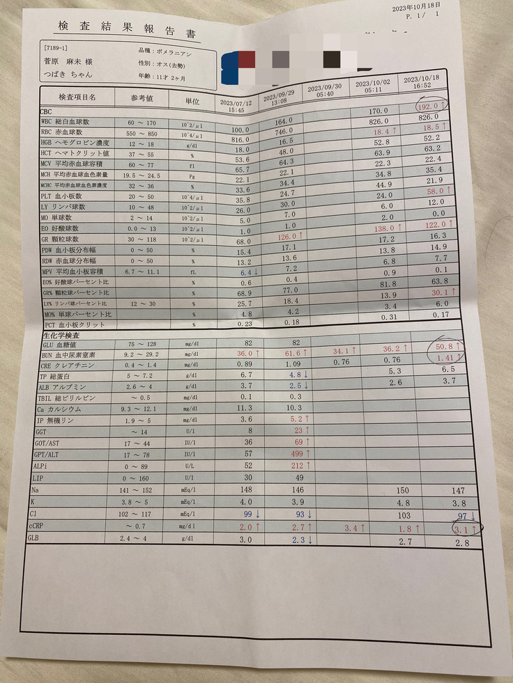 検査結果で数値が上がっている箇所はまた1週間後くらいにかかりつけ病院で検査をされてみてくださいとのこと。