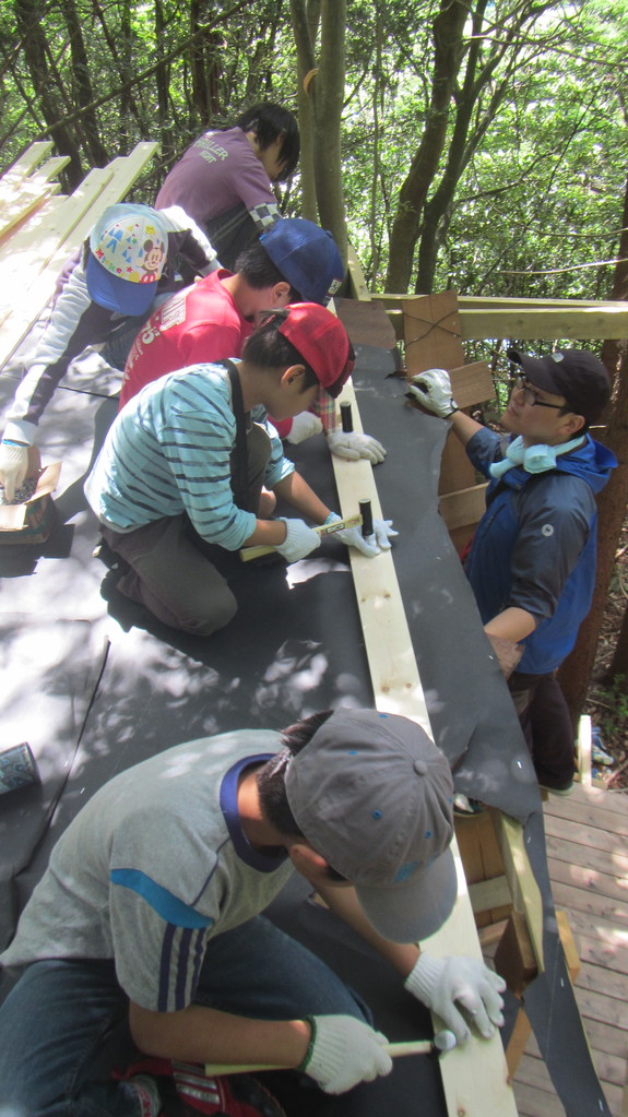 2階の床ができ、子ども達は気持ち良さそうに寝転んでいました。