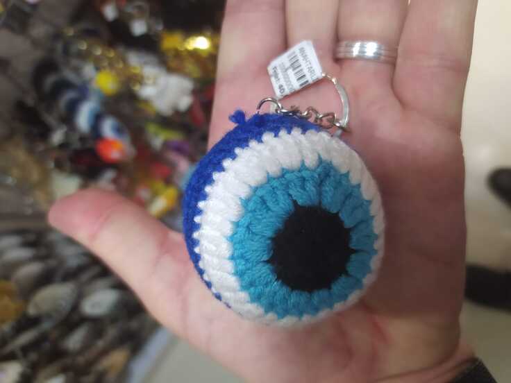 2、トルコ名産「ナザールボンジュウ(目玉のようなデザインのお守り)」:ふわもこキーホルダー/ブレスレット