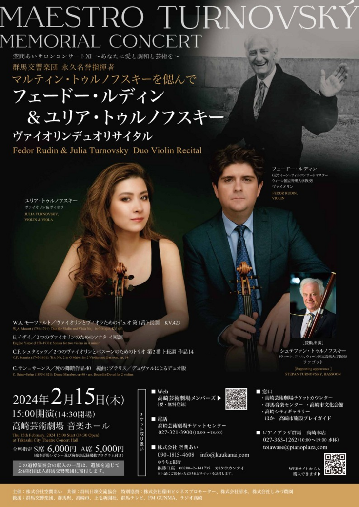 2021年にマエストロ、マルティン・トゥルノフスキーが逝去されてから、追悼演奏会を計画しており、2021年10月に一度計画をしましたが、コロナ禍で来日できず、中止となりました。今回、調整の末、2024年2月15日、高崎芸術劇場音楽ホールにて、群馬交響楽団永久名誉指揮者マルティン・トゥルノフスキーの追悼演奏会を、ご子息のシュテファン・トゥルノフスキーと孫のユリア・トゥルノフスキーとその夫のフェード―・ルディンをお招きして、二人のヴァイオリン・デュオリサイタルとして追悼演奏会を開催することになりました。
